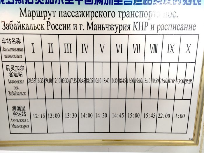 The buses leaving Manzhouli operate on the timetable below (the bottom row), and cannot be booked in advance (even the same day) because most buses make one round trip each day. On weekdays, you’ll usually find a spot on the first bus. A local told us on weekends (when Russians come across to shop) you might need to wait for the second bus.