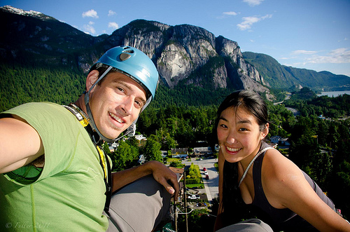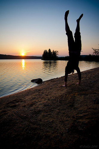 I never thought my Canada Day antics from last year could come close to being topped. (See “What’s your Blood Type (Korea Update)” ). But this year, after spending the evening BBQing, slacklining and sparring as the sun set on Jericho beach, we ambled over to the UBC campus. At midnight, by the light of my mobile phone, Naho and I walked down a long trail that winds through dense forest, down hundreds of stairs to the remote Tower Beach. Oker had organised an unlicensed beach party, complete with turntables and a full sound system, roaring campfire, and even a deep-fryer making yam fries. Things went fantastically and a lot of people had shown up, when someone called to say the cops were at the top of the stairs. Oker cut the power for a few minutes of ‘stealth mode’, and we hoped that they would either be too lazy to break a sweat and hike down, or if they did, would only notice a pleasant campfire (and not the generator and speakers). After a few minutes we relaxed and resumed the music.But then we heard a noise. A noise much louder than our massive speakers. A noise that sounded an awful lot like a helicopter. I looked up, just as the blinding helicopter spotlight lit up the beach like the ugly-lights at a club. Overwhelmed with national pride, I began singing ‘Oh Canada’ at the helicopter, and everybody joined in. I can only guess the helicopter was a (very expensive) way for the cops to avoid getting any exercise hiking down those stairs. But it didn’t work, because he kept dancing for another ten minutes, until the cops came down in person to bust up the party. I considered starting a riot, but there weren’t any nearby cars to flip over and burn. Oh, Canada.